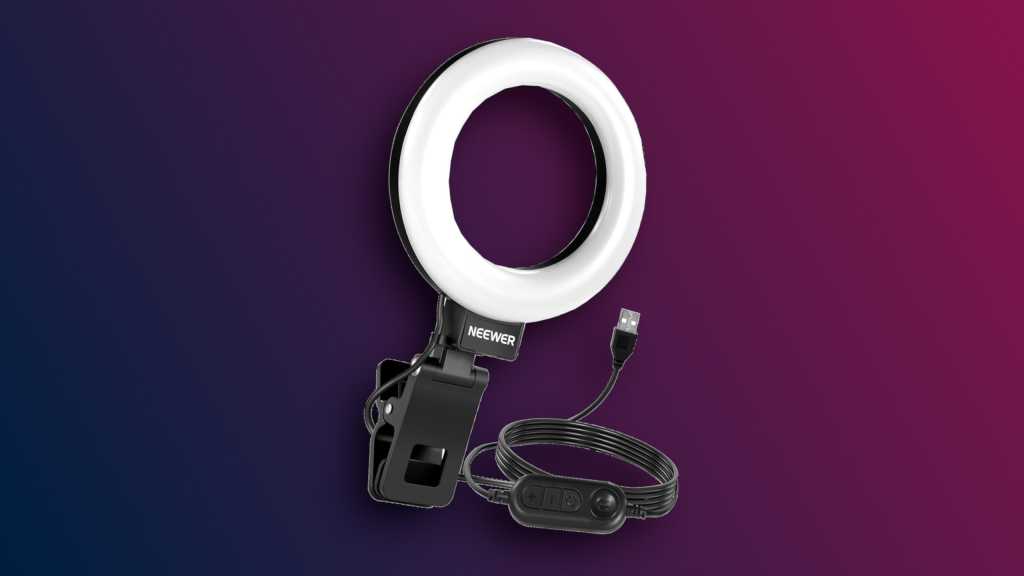 I purchased this 5-inch Neewer ring light on Amazon and love it. It only cost me about $15—the price fluctuates with sales and on-page coupons—and it was absolutely worth it. Powered via USB, I just have to plug it into my PC or any USB charger and it’s good to go. There’s a nifty remote on the cable that lets me control brightness and color temperature, and it remembers those settings between uses. Once I got it set up how I like, I’ve only been pressing the power button to turn it on and off.