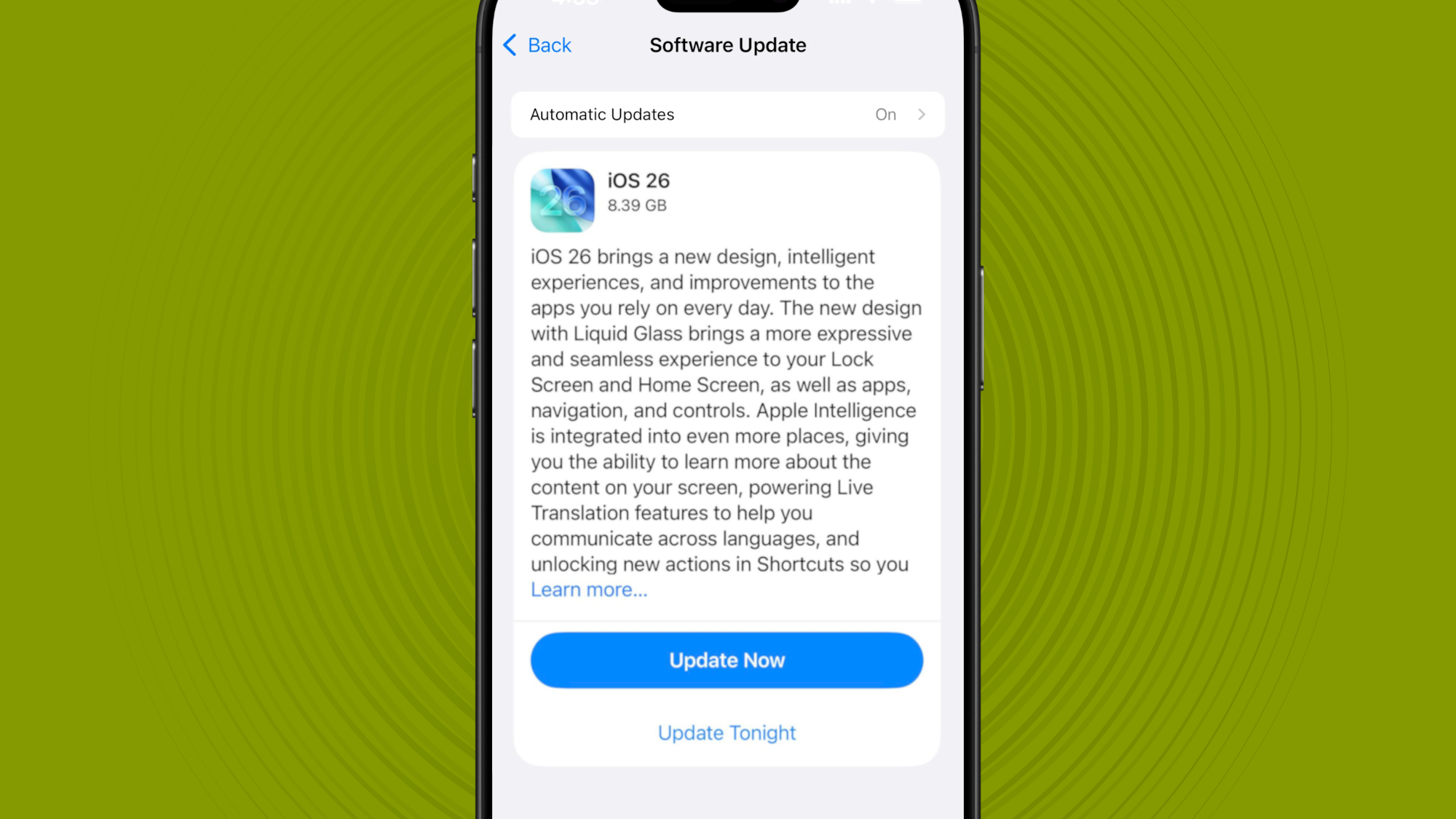 Once you’ve confirmed that your iPhone has enough free space to download iOS 26, tap either ‘Update Now’ or ‘Update Tonight’. Both options will prompt you to enter your iPhone passcode, and you’ll then have to agree to the Terms and Conditions.