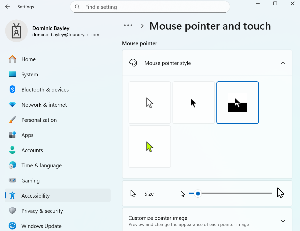 - Open the “Settings” app and type mouse in the search box. Select Mouse Settings and navigate to Accessibility mouse settings > Mouse pointer.